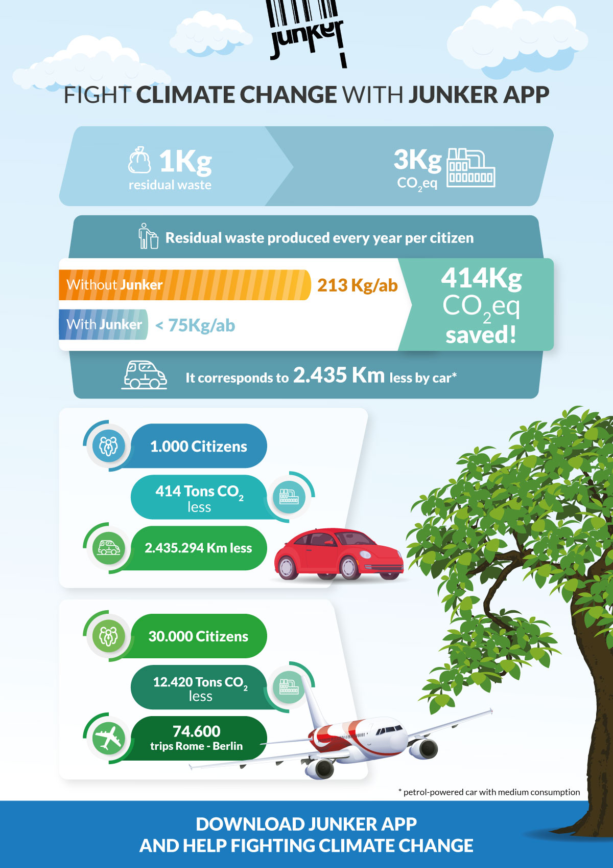 Here comes the interesting part for the municipalities: by multiplying this number for a hypothetical number of citizens, let’s say 1000, one would save 414 tons of CO2eq, which means 2.435.294 km less by car! According to this argument, if Junker users really succeeded in reducing their quantity of produced residual waste and achieving the goal of 75 kg, we would estimate how much Junker could reduce CO2 emissions deriving from residual waste management in each municipality!
